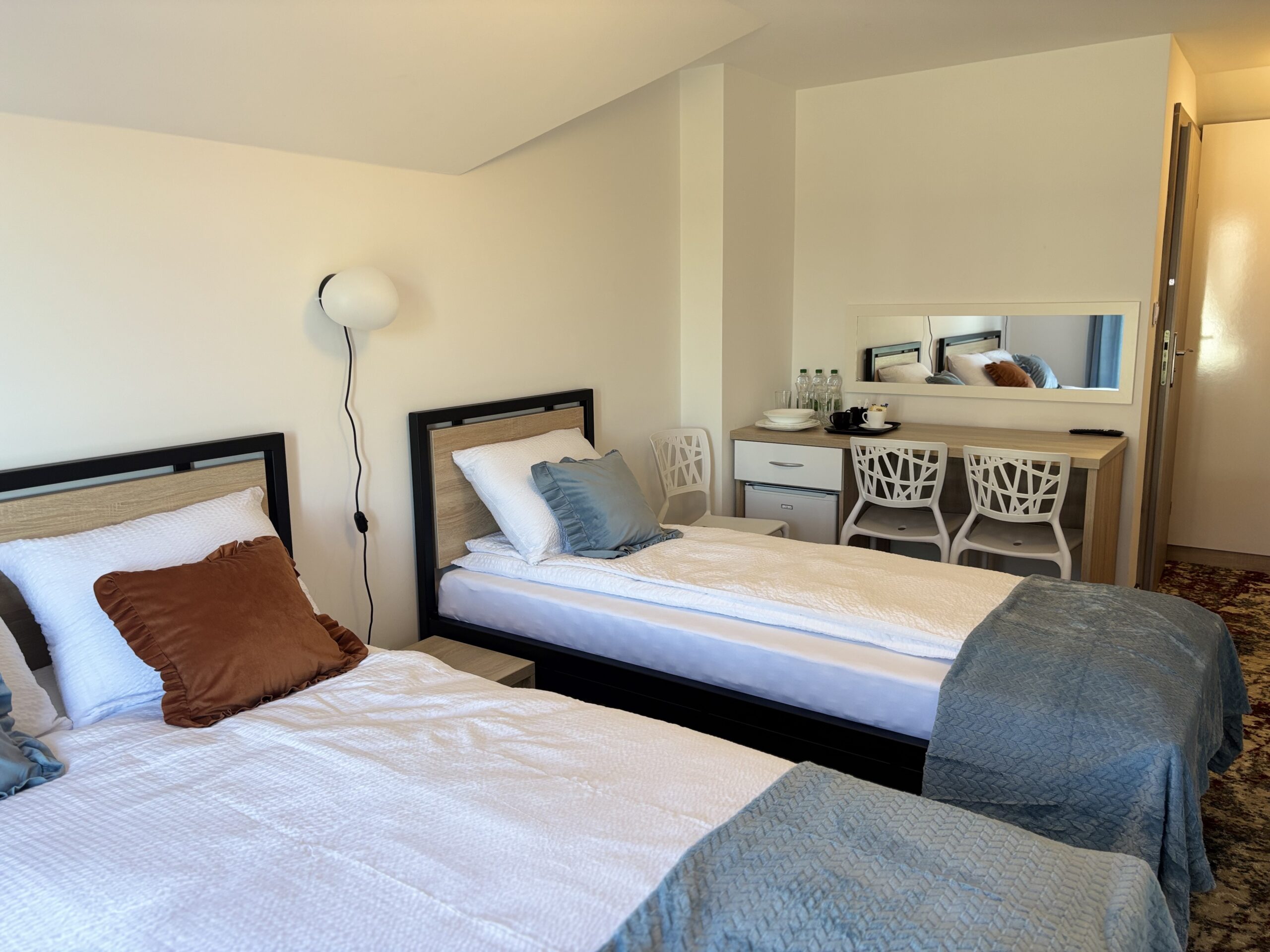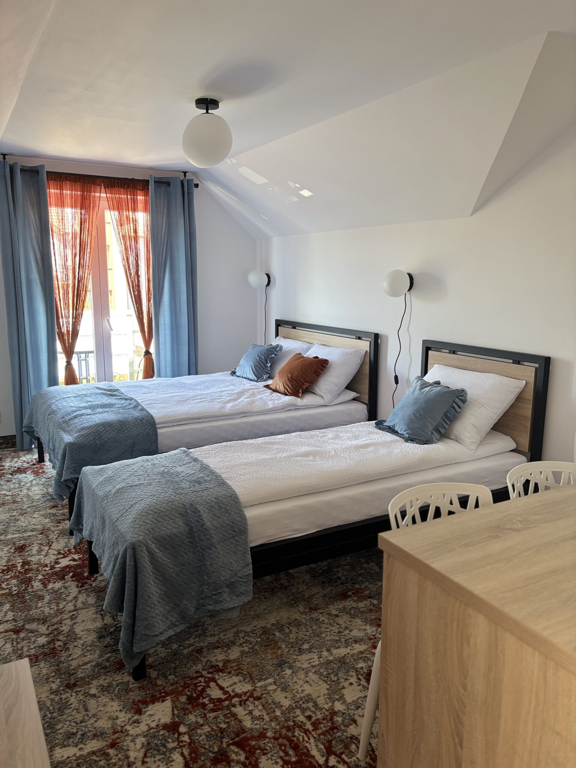 Pokój idealny dla par z dziećmi w którym znajdą Państwo wygodne łóżka, jedno pojedyncze oraz jedno podwóje. Wnętrze oferuje dużą, pojemną szafę, telewizor, wiatrak oraz prywatną łazienkę z kabiną prysznicową.